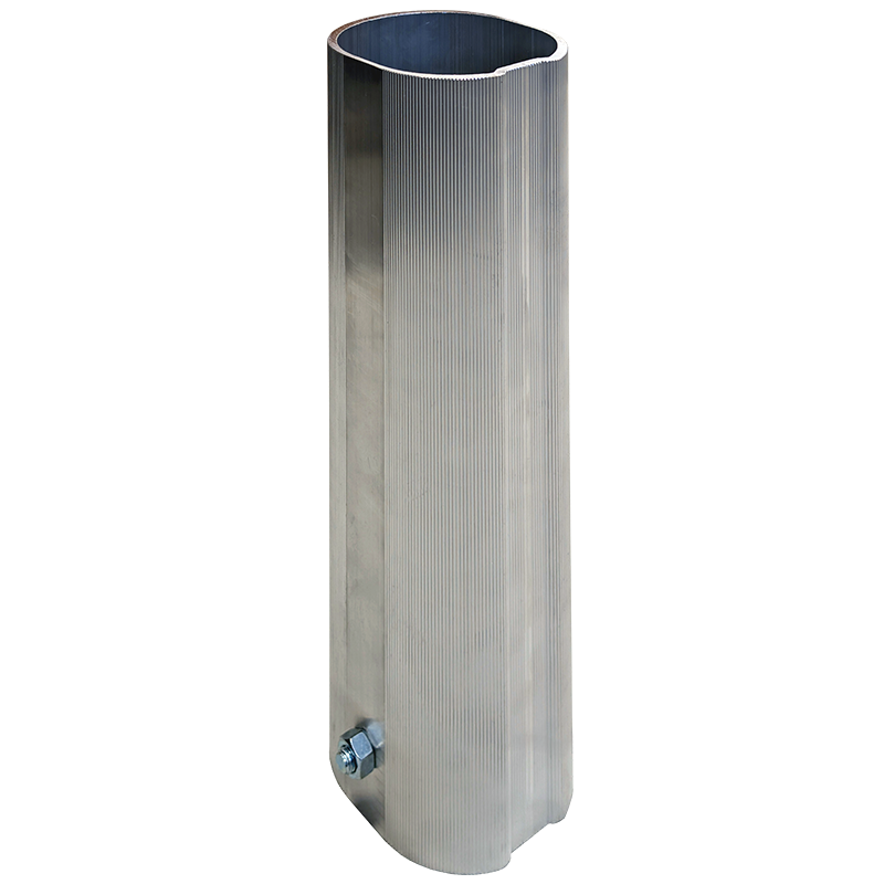 Mounting sleeve designed for fixing aluminium posts for volleyball (cross-sections 120 × 100 mm and 116 × 76 mm) and tennis (cross-section 120 × 100 mm). The sleeve is made from a high-strength grade of aluminium, and its ribbed external surface significantly improves adhesion within the concrete foundation.
